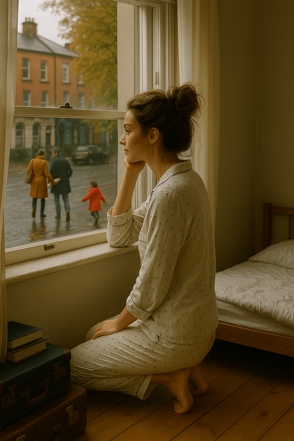 Padding barefoot across creaky floorboards, she opened the window a crack, welcoming the fresh, earthy scent of rain that still lingered in the air. Resting her chin on the windowsill, Joelle gazed down at the street below, watching early commuters move in a calm, unhurried rhythm that was strangely comforting. A woman in a mustard wool coat linked arms affectionately with a man holding a fresh loaf of bread wrapped neatly in wax paper. Nearby, a child in a vivid red uniform joyfully splashed through puddles, completely indifferent to soggy shoes. Life seemed slower here, softer.